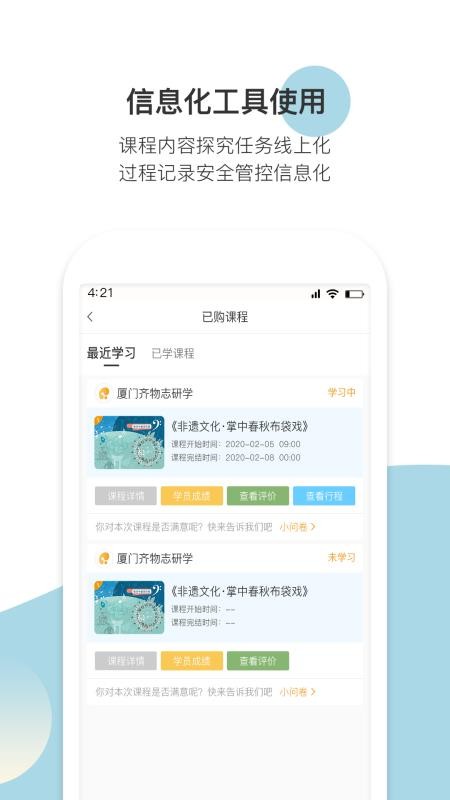 4、进入已购课程版块,查看最近学习的各个课程信息,了解详细行程安排