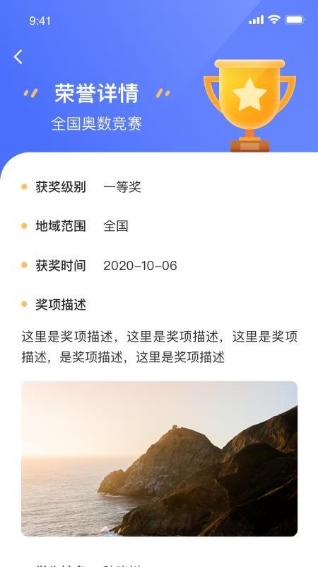 6、拥有荣誉详情,用户在这里能够清晰看到获奖级别、地域范围、获奖时间和奖项描述内容;