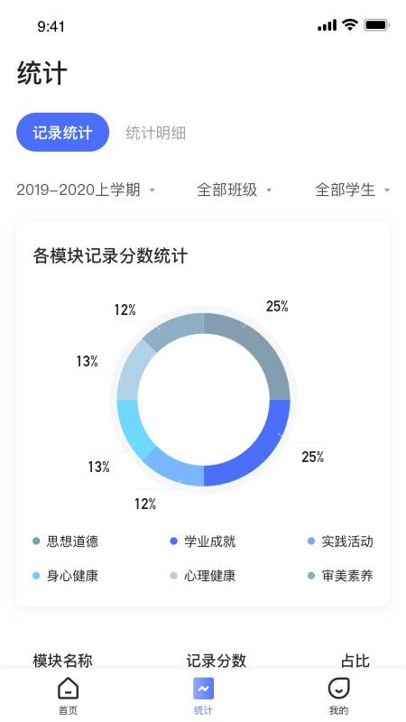 3、进入统计版块,查看各种记录统计内容,了解详细的模块分数和占比情况