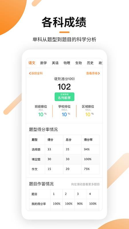 1、用户在软件中能够清晰看到自己不同题型的得分率和详细题目作答情况;