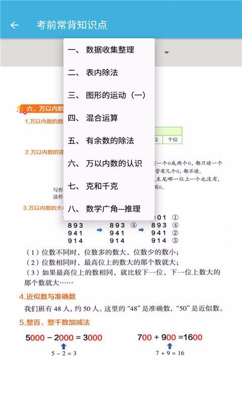 4、多种考前常背知识点分类,这些分类涵盖混合运算、克扣千克和表内除法等;