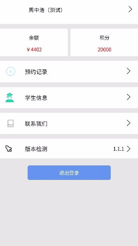 5、进入我的页面后,就可以选择预约记录、学生信息、充值积分、联系我们等功能进行使用