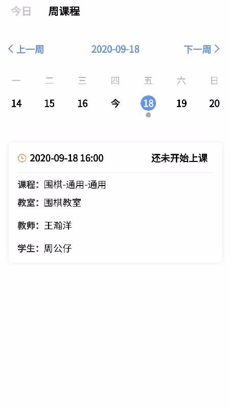 2、进入周课程页面,可以查看每周的课程安排,切换时间查看课程表内容