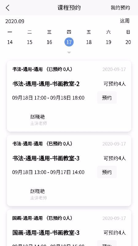 1、支持课程预约,根据日期查看课程类型,一键完成预约;