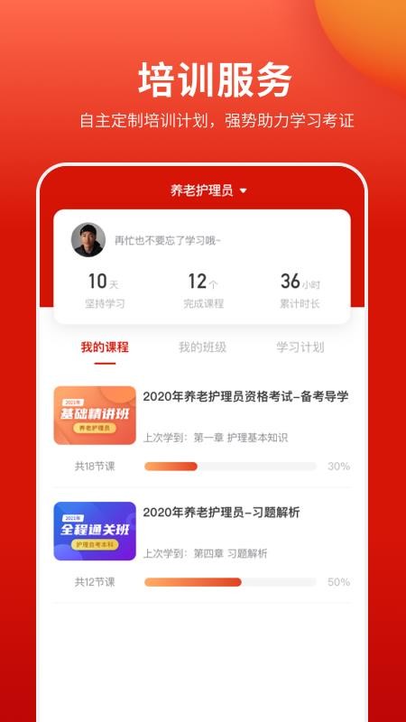 3、进入学习版块,查看自己的课程学习进度和班级信息,调整学习计划