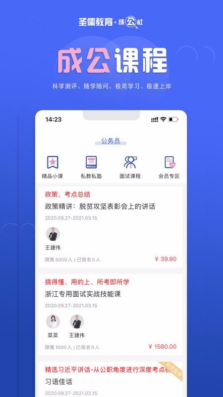 2、进入公务员页面,可以选择精品小课、私教私塾、面试课程等专区进行查看