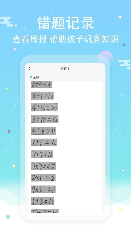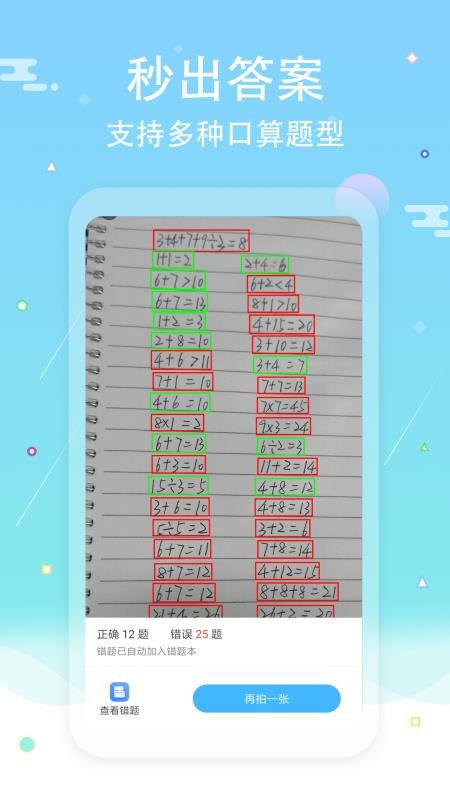 口算拍照批改app是一款多功能的作业批改软件,每一个用户都可以通过拍摄作业照片的方式,快速进行作业的批改,支持多种口算题型,能够快速和准确的计算出题目是否做错,并且会以鲜明的颜色进行标注,让家长能够迅速批改孩子的作业,提升辅导的效率;值得一提的是,该应用还提供了错题本板块,批改出的各种错题会自动的加入到错题本中,并以列表的形式呈现在应用上,孩子可以更加直观的进行查看,随时回顾自己的错题历史,能够更好的巩固知识,不会再犯相同的错误;还等什么,感兴趣的话就抓紧时间下载体验吧。