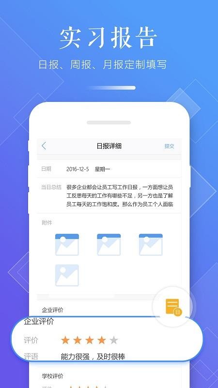 3、能够及时查看企业评分和学校评价的信息,清楚自己实习结果内容,展示详细的报告;