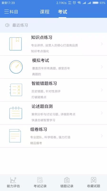 4、进入考试页面,就可以选择错题记录、考试记录、收藏试题、能力评估等板块进行查看