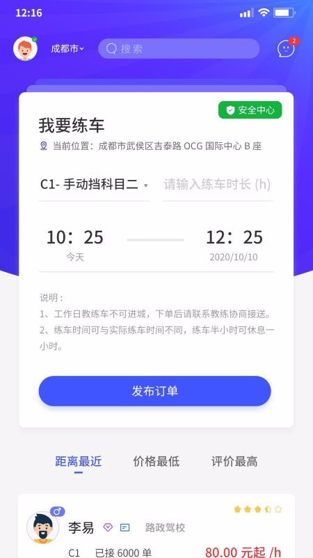2、进入首页中,就可以发布订单进行预约练车,也可以浏览推荐的教练