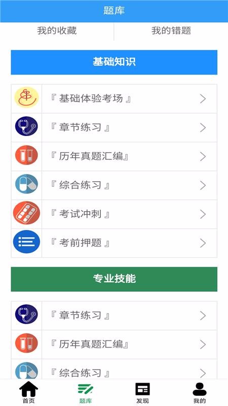 4、便捷多样的题库分类排版设计,里面将基础知识、专业技能进行划分,还展示清晰多样的练习模式列表;