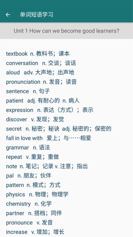 2、在单词短语界面中,可快速查看到各单元的单词短语