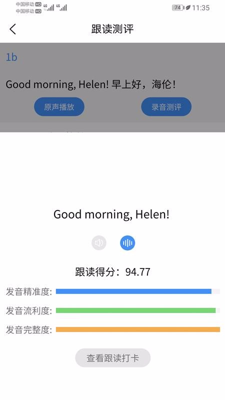 3、支持跟读测评,可以播放原声进行收听,并录音完成跟读,实时查看跟读得分;