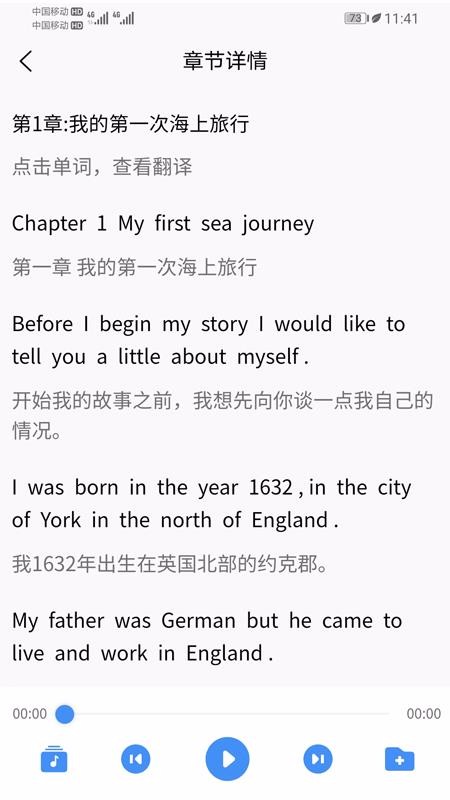 3、在课文朗读页面,可以点击播放、上一章、下一章、暂停等功能进行使用
