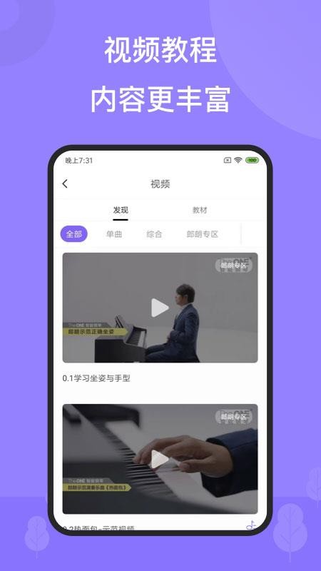 2、丰富多样的视频教程内容,有单曲、综合和郎朗专区演奏的视频教程,高效学习;