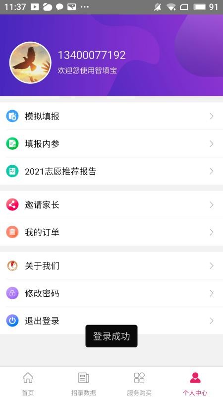 5、打开个人中心,快速进行模拟填报,了解志愿推荐报告内容,查看自己的各个订单信息