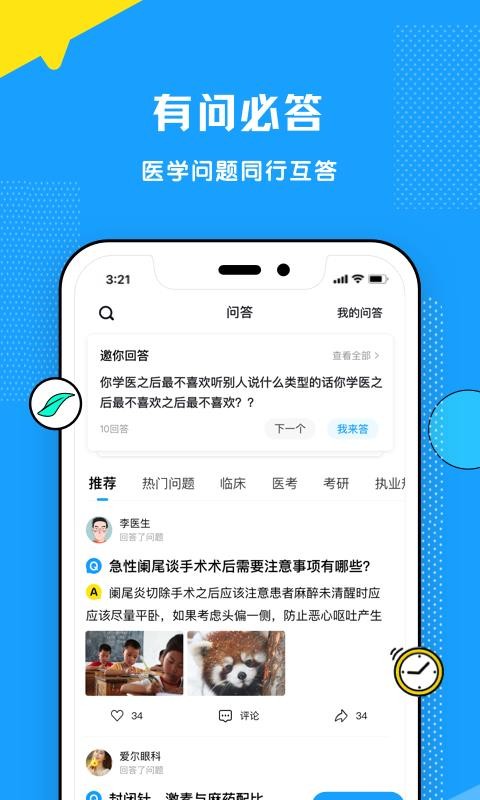 2、支持回答别人的提问,在问答页面随时评论和在线讨论医务工作的经验;