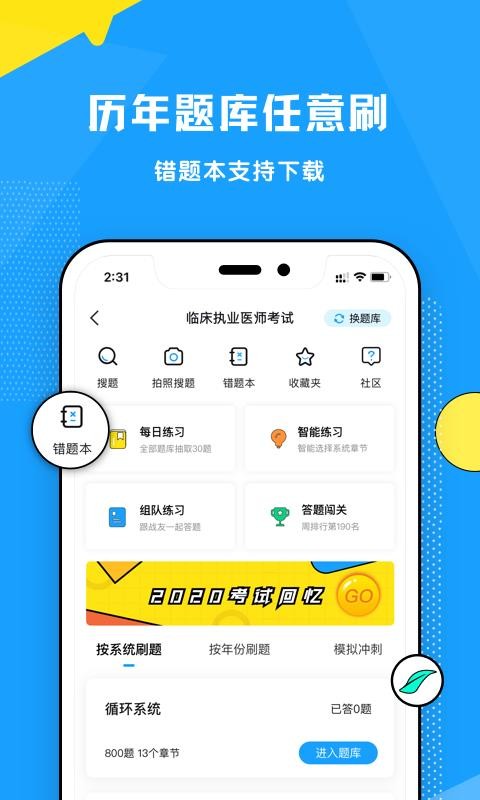 2、提供有很多学习的模式专区,包括了医考题库、考研题库、答题闯关、疾病查询等;