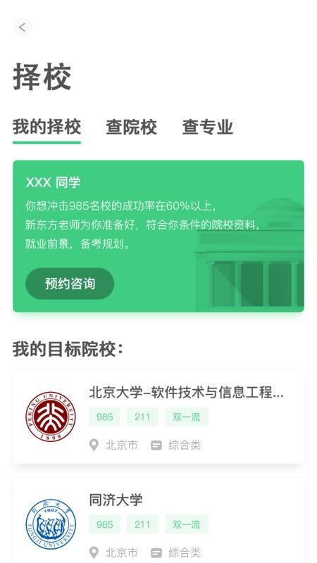 5、打开择校版块,查看自己的目标院校信息,在线查询各种院校和专业详情