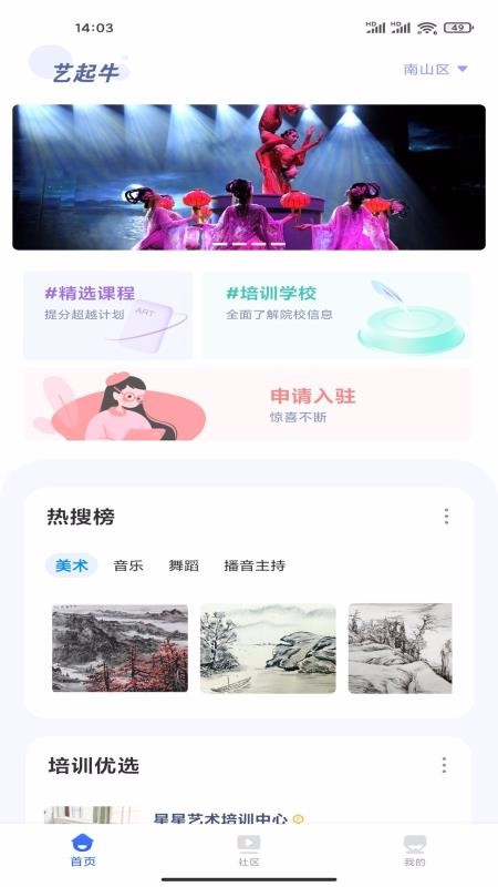 艺起牛是一个艺术培训和教育平台,也结合社交互动的形式,帮助用户一站式完成培训学习和信息沟通;在这里,用户可以浏览到各种类型的培训课程和培训机构,而且涵盖的艺术领域广,涉及了音乐、美术、舞蹈、表演等类型,可以让用户一站式学习丰富的艺术知识,并且该平台也适合艺考人员的使用,可以让艺考用户便捷的完成培训教育,还可以发现各种艺考信息和资讯内容;除此之外,该软件也是一个专业的数据平台,包括了艺术交流、艺术教育、教学质量评估监管、个人原创作品发布等功能,可以让个人用户找课程、找机构,也可以帮助机构找学生。