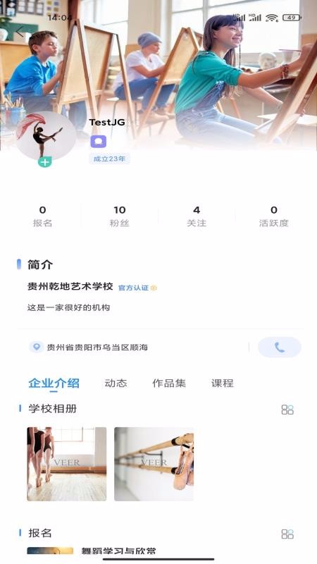2、支持关注学校,还可以查看该学校的报名动态、作品集和课程信息;