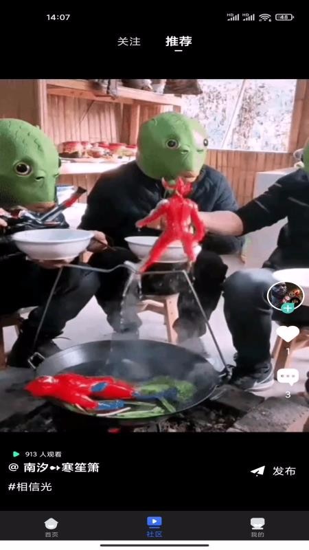 4、在社区中,用户可以浏览推荐的视频动态,并进行关注、点赞或评论