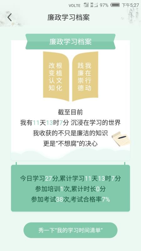 3、廉政档案中包括了学习时间、参加培训次数、考试合格率等,可自行查看;