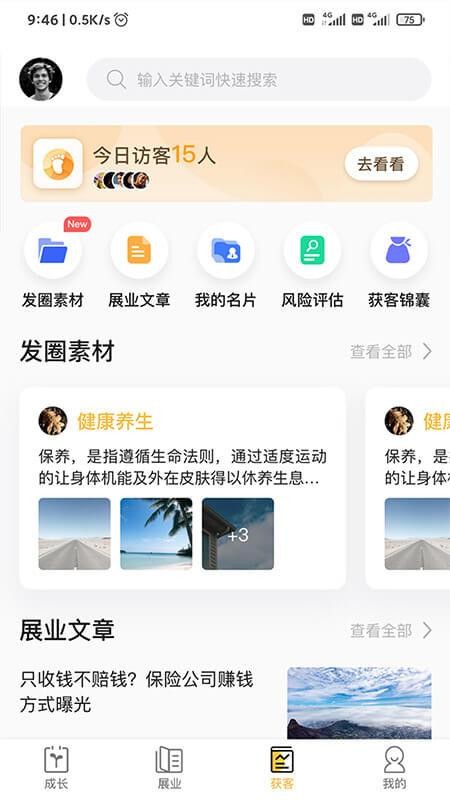 4、进入获客版块,查看各种素材和文章内容,更加高效的进行展业获客