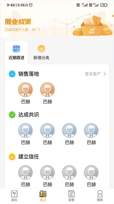 3、进入展业版块,查看自己近期跟进的各个客户信息,了解自己的展业成果