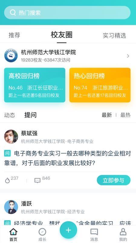 2、切换到校友圈中,立即了解榜单的信息,查看提供和校友的动态内容