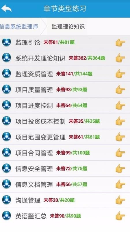 1、选择考试科目之后,就可以查看提供的练习题目,并分类浏览题库;