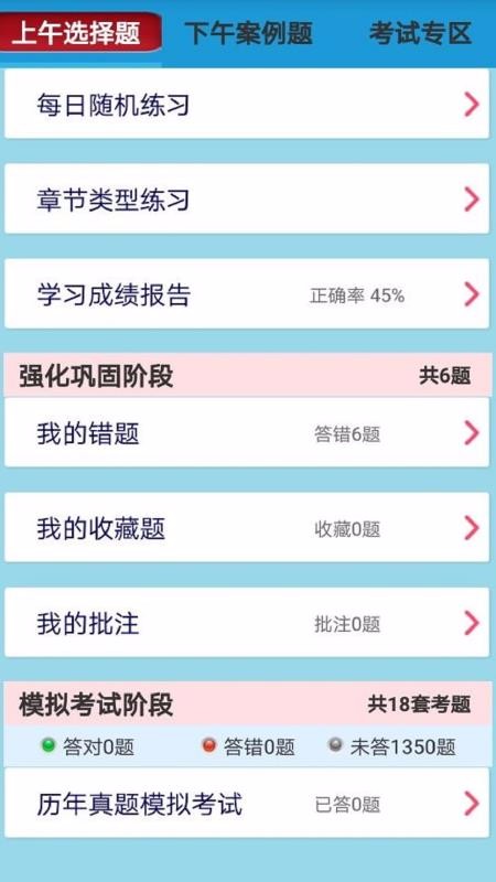 3、进入练习页面后,就可以查看展示的案例题、选择题、考试专区和练习数据