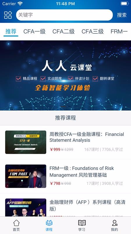 人人云课堂是一个财经教育和金融培训平台,也为培训机构、企业提供了在线教育解决方案,而且结合课程分销、点播教学、直播教学、教学管理等功能,可以帮助用户在线搭建专属的品牌教育平台,也更好的开展网络教学服务;除此之外,用户还可以在这里学习丰富的金融知识,涵盖的金融课程也多样,自动按照等级进行分类展示,用户可以按照需求选购合适的课程,并线上观看视频完成学习;所以,想要学习更多金融知识,就可以通过该平台进行查询和了解,也结合各种学习工具和教学服务,让用户享受便利的线上学习体验。