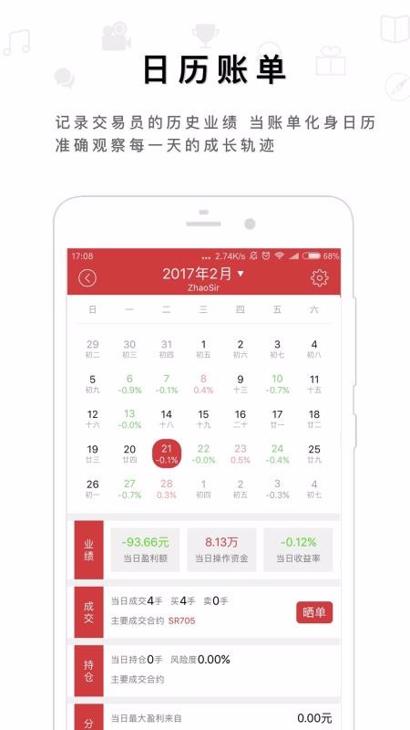 5、提供了日历账单,可以根据日期查看历史的业绩数据、成交额、持仓数等;