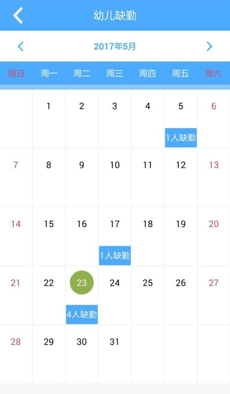 2、应用中有幼儿缺勤版块,在这里用户能够清晰看到各个幼儿的缺勤情况;