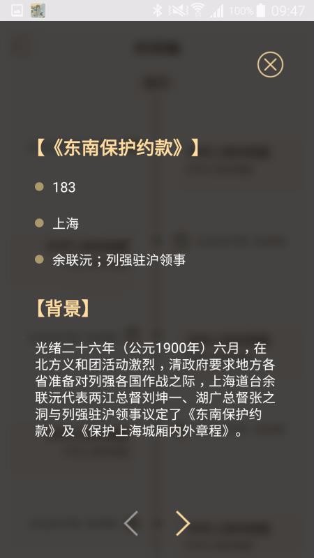 4、了解条约签订的地点以及签订人物信息,点击左右切换图标即可切换查看其他条约