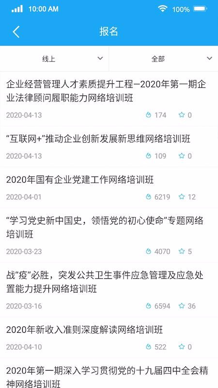 1、根据线上、线下或类型筛选推荐的报名动态,选择培训活动可以一键完成报名;