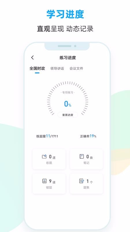 5、直观的学习进度窗口,练习进度页面展示了不同板块的练习进度参数、收藏、笔记以及错题数量等信息;