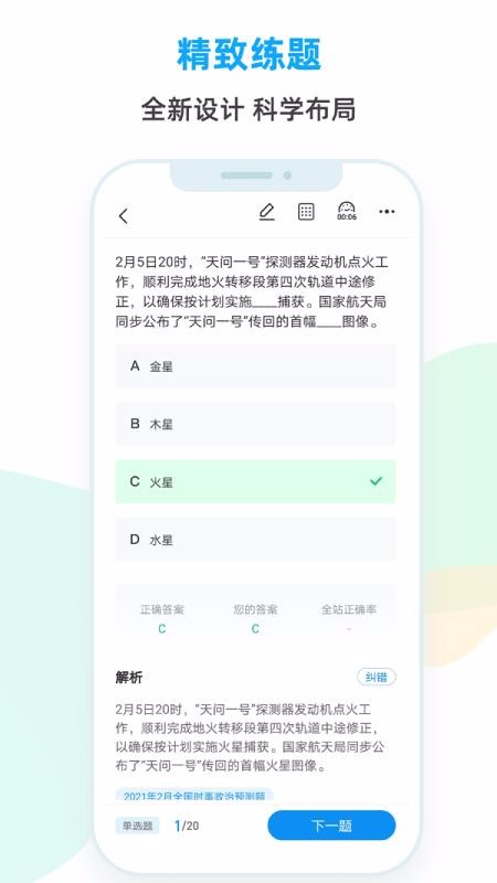 时政题库是一款专门学习时政的软件,以时政刷题为主要的学习模式,适用于国考、省考以及事业单位等公务员考试的时政备考需求;该平台汇总了大量的历史时政问题资源,同时还会不断更新时政信息问题,给备考用户们提供热点题目内容,提高考试的涉及范围,从而提高自己遇到原题的几率;它还与其他的刷题备考平台一样,为用户设置了许多的刷题模式,涵盖重要知识点的专项练习,也有实战性质的模考大赛,通过这些模式能让用户提高时政热点的学习和记忆效率;除了实战性的刷题练习模式外,这里还给用户提供音频播报形式的时政内容,全面提升考生对时政掌握度。