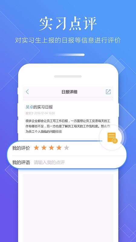 5、详细的记录实习生的日报信息,知道每天的学习情况,并根据学习日报快速点评,提高实习管理的能力;