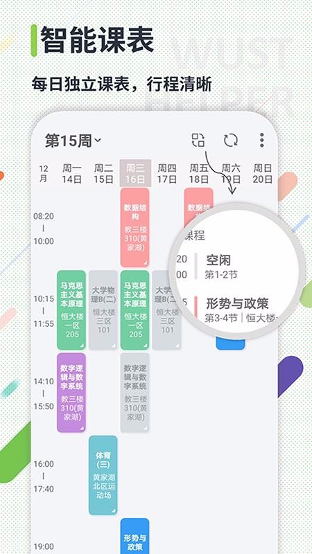2、查阅课表安排,进入智能课表页面后就能查看自己每周的课程安排;