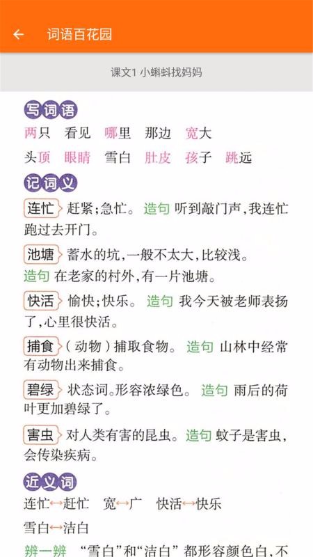 1、支持词语学习,整理了全册的课文词语、近义词、反义词等,并标注了各词义;
