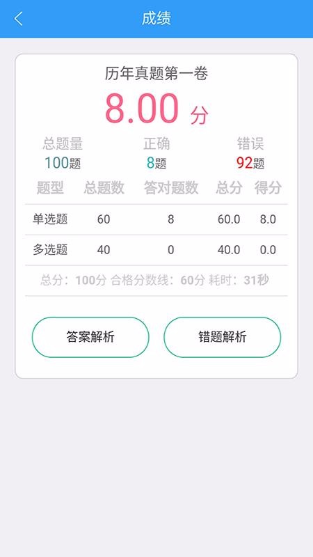 4、选择题库练习结束后,就可以查看成绩分析,并浏览提供的错题分析或答案解析