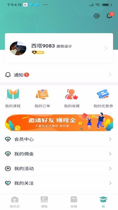 5、在我的页面里,为用户展示了通知、订单、收藏、会员、关注等功能