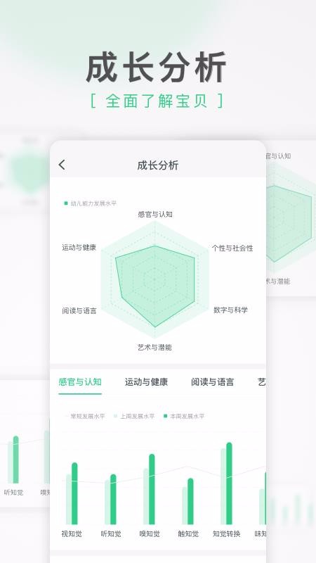 4、丰富的成长分析内容数据,上面划分了感官认知、远动与健康、阅读与语言等众多类别栏目;