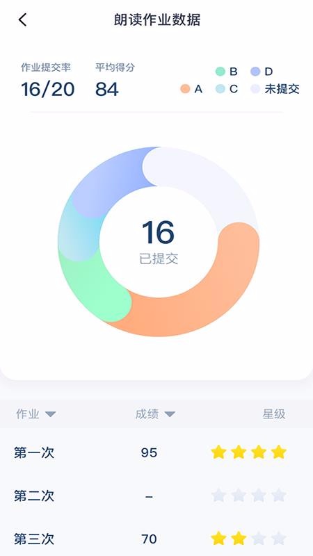 5、进入作业数据页面,就可以查看作业提交率、平均得分、成绩、星级等数据信息