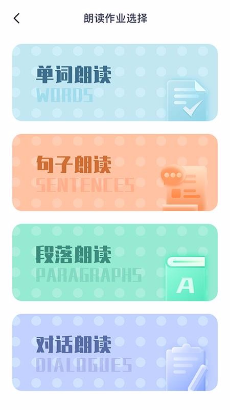 4、在作业的选择页面,切换到朗读作业后,用户可以选择单词朗读、句子朗读等作业进行完成