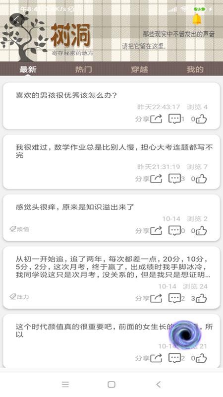 3、进入树洞版块,快速写下自己的各种烦恼和心事,舒缓自己的学习压力
