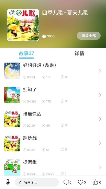 4、进入专辑版块,查看各种儿歌专辑中的儿歌信息,快速发表自己的评论