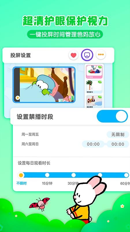 2、提供有便捷投屏方式,轻松打开投屏,让孩子在合适的距离观看视频,设置禁播时间;